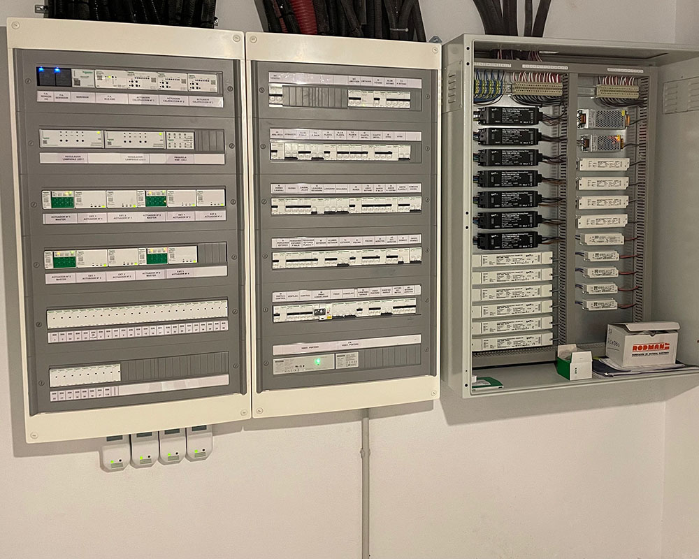 Instalación domótica en vivienda unifilamiliar, iluminacion con regulación DALI, alarmas técnicas de inundación, CO, CO2 y humos, estación metereologica, control total de las instalaciones.