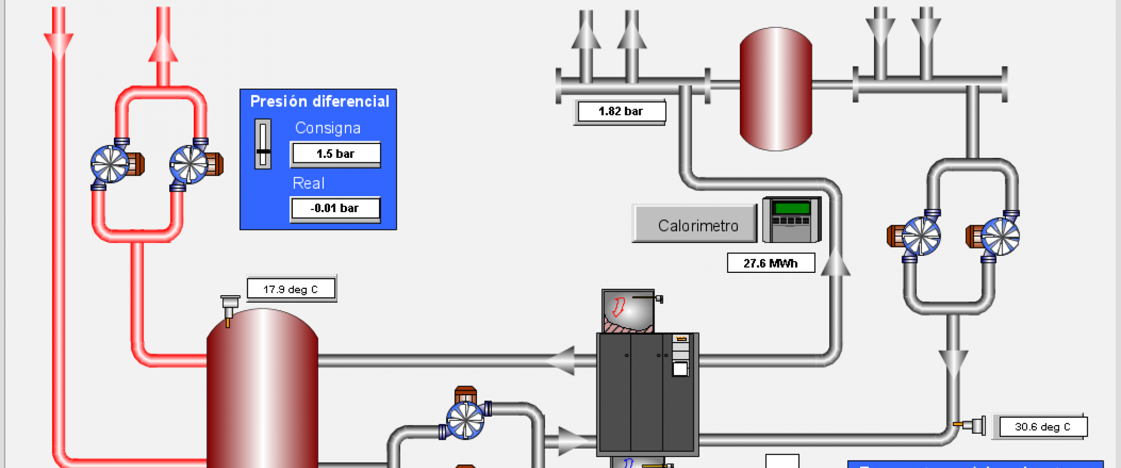 Se programa un supervisor de la marca Johnson Controls y cinco controladores en red, así como un SCADA de supervisión. El sistema controla la producción de frío y calor y la climatización de las oficinas.